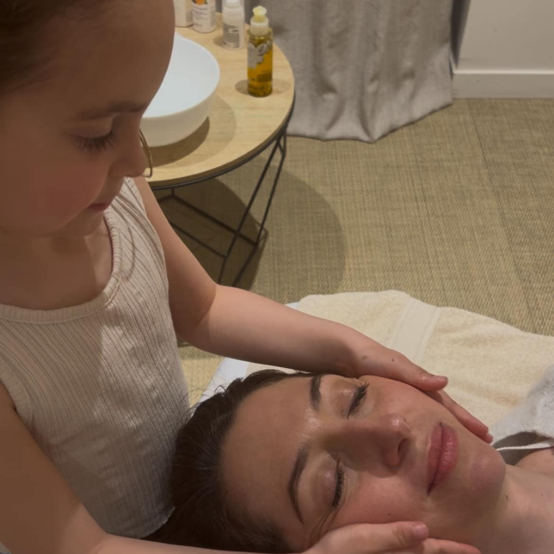 Sur table de massage, installé confortablement, l’enfant reçoit un massage du cuir chevelu, du corps et des pieds avec une huile bio.